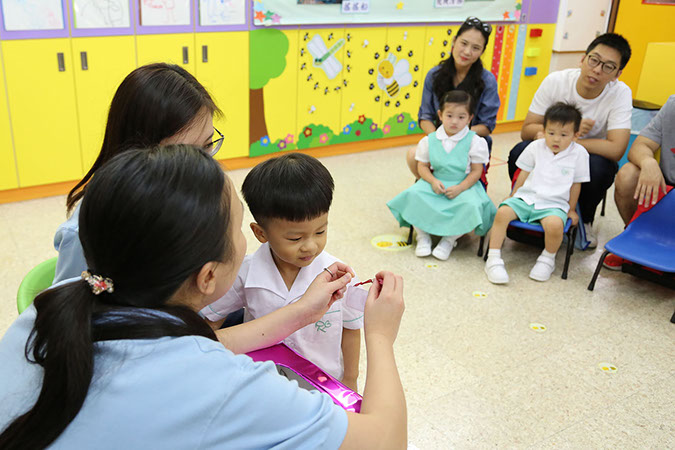 8月29日是幼兒班的開課日,家長陪同幼兒一起到校,他們歡歡喜喜進入課室。上課前先由校長甘麗貞修女透過視像歡迎各位家長及幼兒,跟著老師利用手偶和歌曲與幼兒打招呼,又以遊戲的方式派發組別名牌給幼兒,最後還拍攝組別相作留念。幼兒在短短的一小時內感受上課的樂趣,為他們的學習生活帶來新開始。