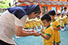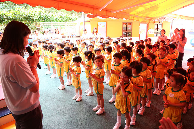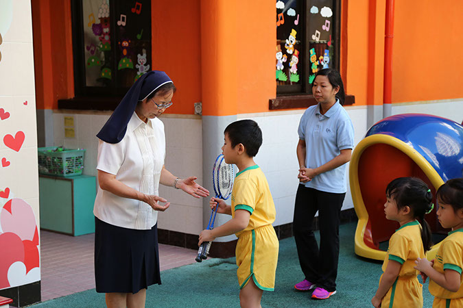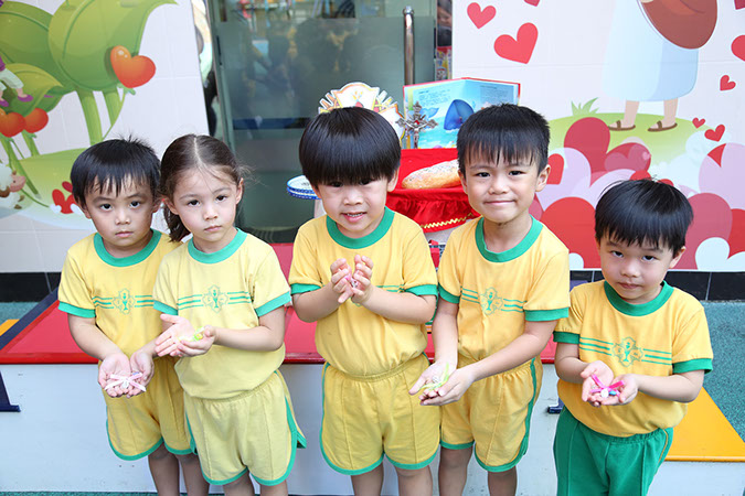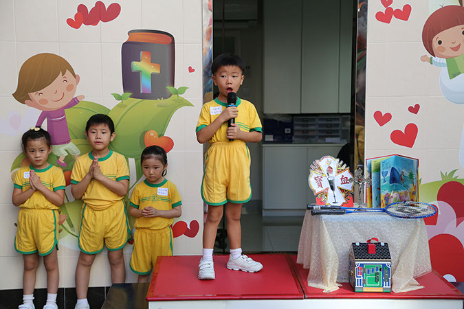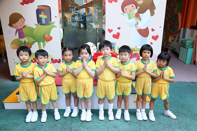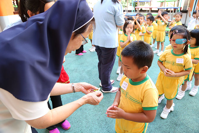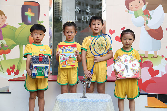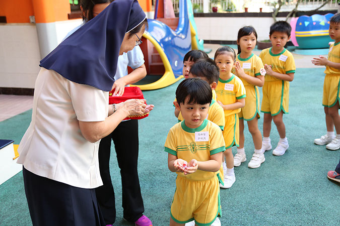 當日宗教老師先帶領全體師生祈禱,然後學生代表獻上物品及禱詞(校徵代表寶血幼稚園;球拍表示健康的身體;宗教書籍象徵知識;玩具屋代表我們的家庭;大麥包象徵每個人都獲得溫飽)。接著,由甘修女頒發聖牌給已經領洗成為天主教徒的小朋友,聖牌已請北角聖猶達堂助理司鐸麥英健神父祝聖,請他們每日都戴上,提醒大家是基督徒的身份,活出愛人如己的精神。