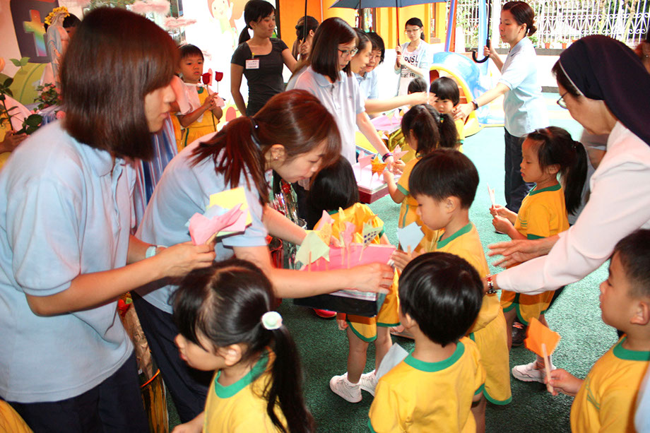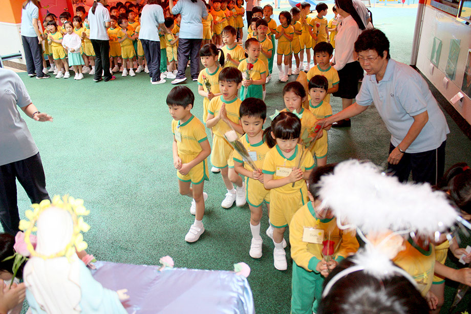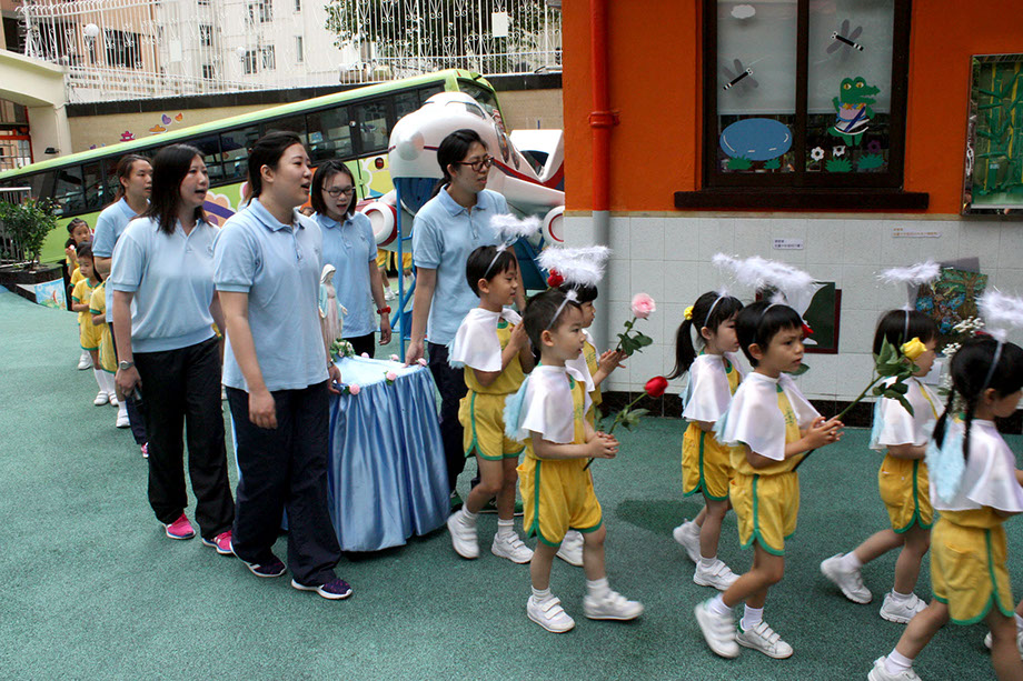 本校於五月四日(星期四)舉行了聖母月敬禮活動-聖母巡遊。由甘修女及公教同學代表領路,護送著聖母像由後走廊出發,經過活動室,最後到學校操場,沿途詠唱「法地瑪聖母」。其後,一同頌唸聖母經,甘修女更為聖母像加冕,最後幼兒上前獻上心心和花朵,藉此表達對聖母的孝愛。